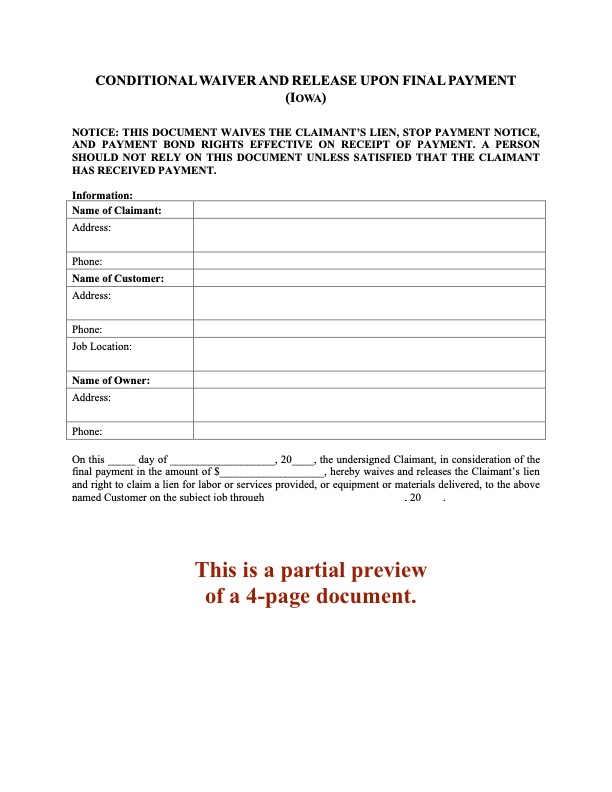 Iowa Unconditional Lien Waiver and Release - Final Payment