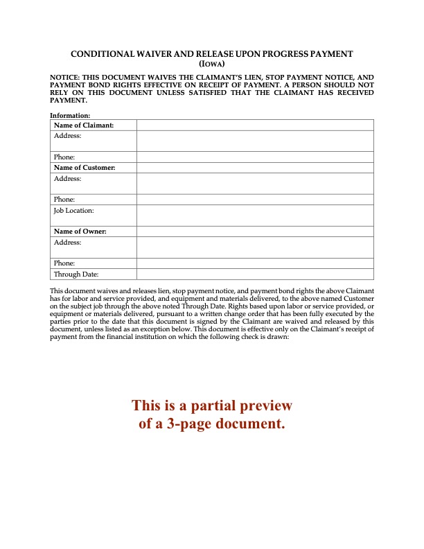 This Waiver and Release form is intended exclusively for use within the State of Iowa. Because lien waiver and release laws vary significantly from state to state, this form may not be valid or appropriate for use outside of Iowa. If you are working in a different jurisdiction, it is essential to consult local regulations and requirements before using a waiver or release form.