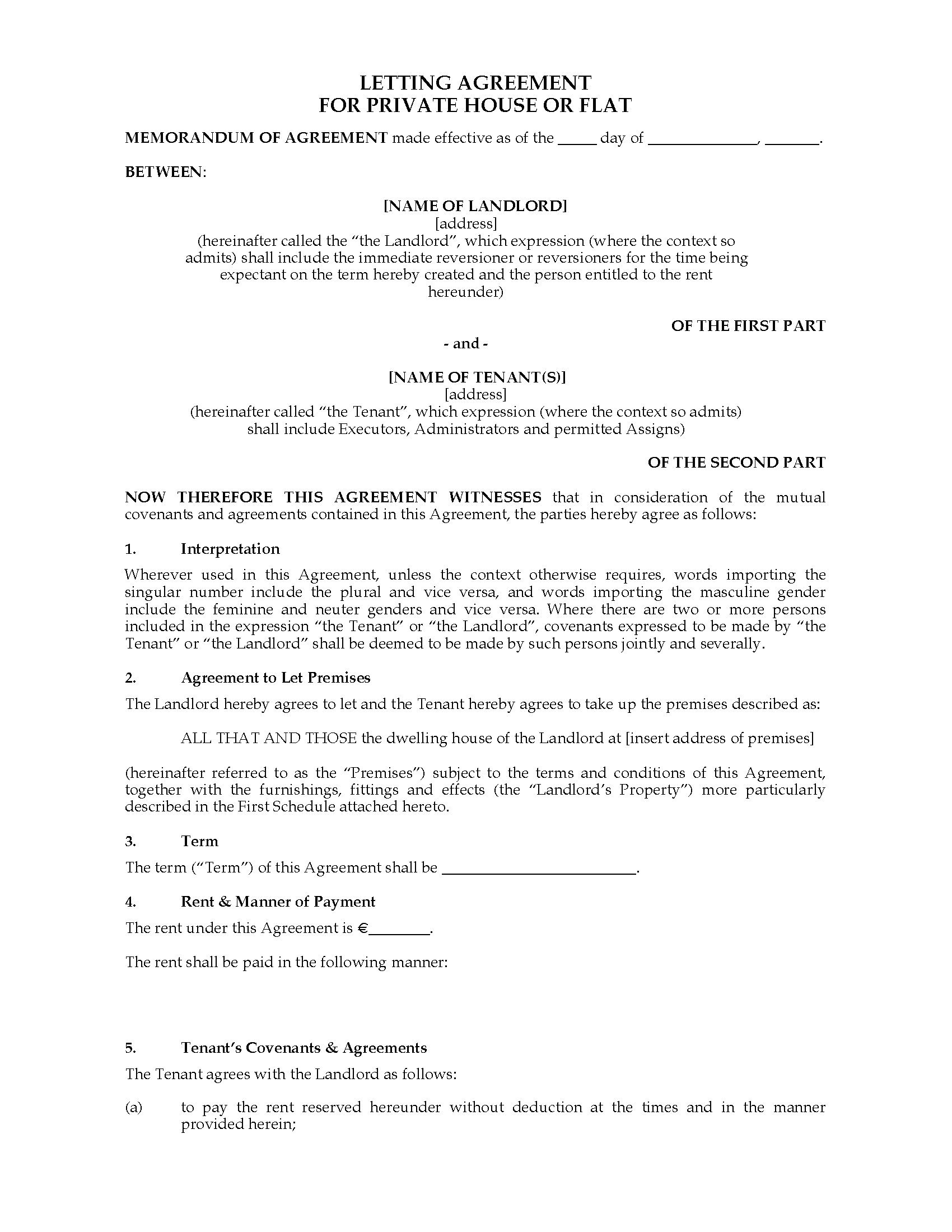 Irish landlords, let a private house or flat to a tenant with this template Letting Agreement for Private House or Flat. The Agreement is governed by the laws of the Republic of Ireland. The tenant's responsibilities under the Agreement include: