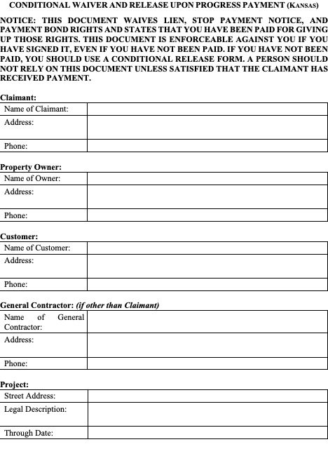 Kansas law does not require statutory forms for lien waivers and is mostly silent on what a lien waiver form should include as far as language and content.