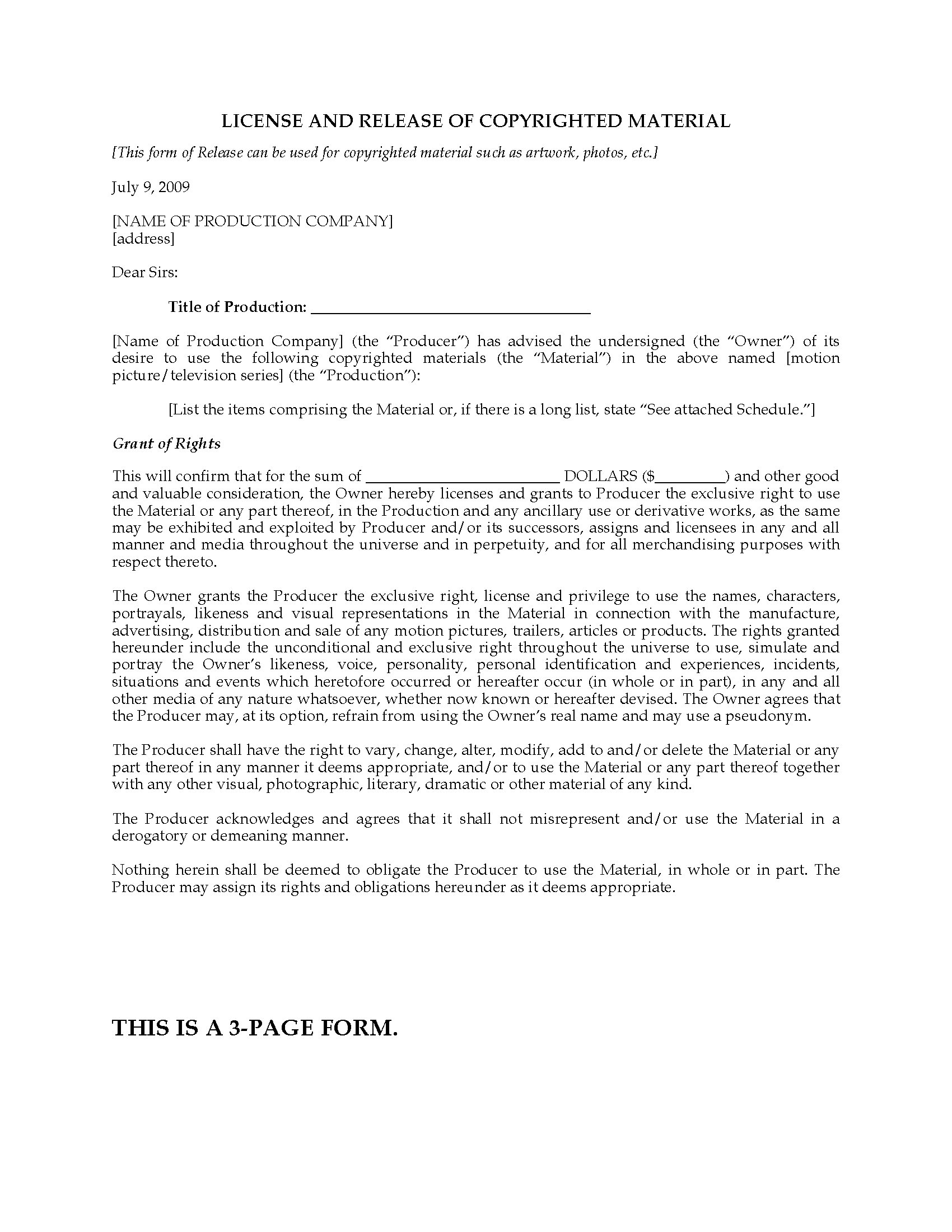 - The property owner gives the production company permission to use the property as a film location and releases the producers from future claims for loss or damage.