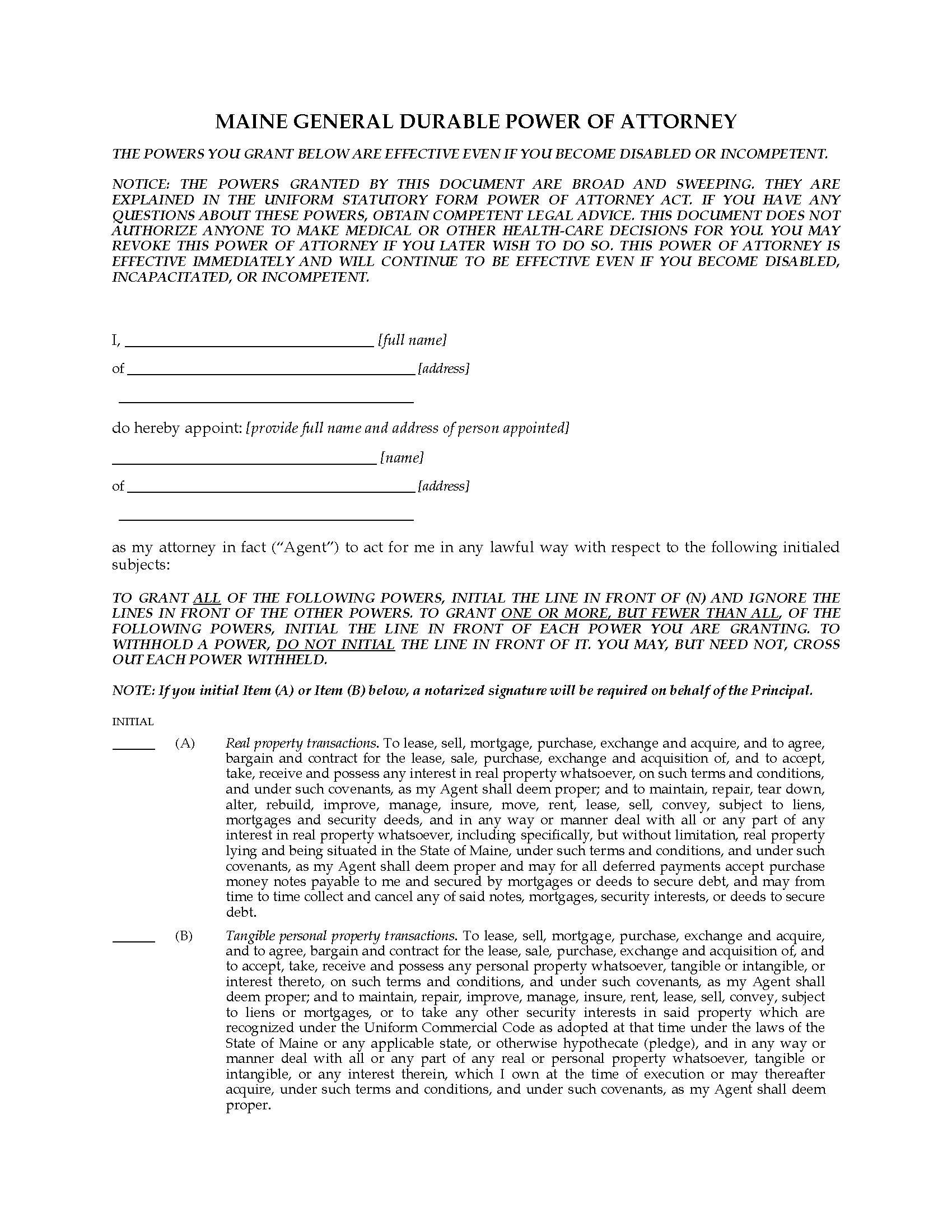 Maine General Durable Immediate Power of Attorney form is available in MS Word format, and is easy to fill in and print. No need to buy additional copies - you and your spouse can each prepare a Power of Attorney with this form.