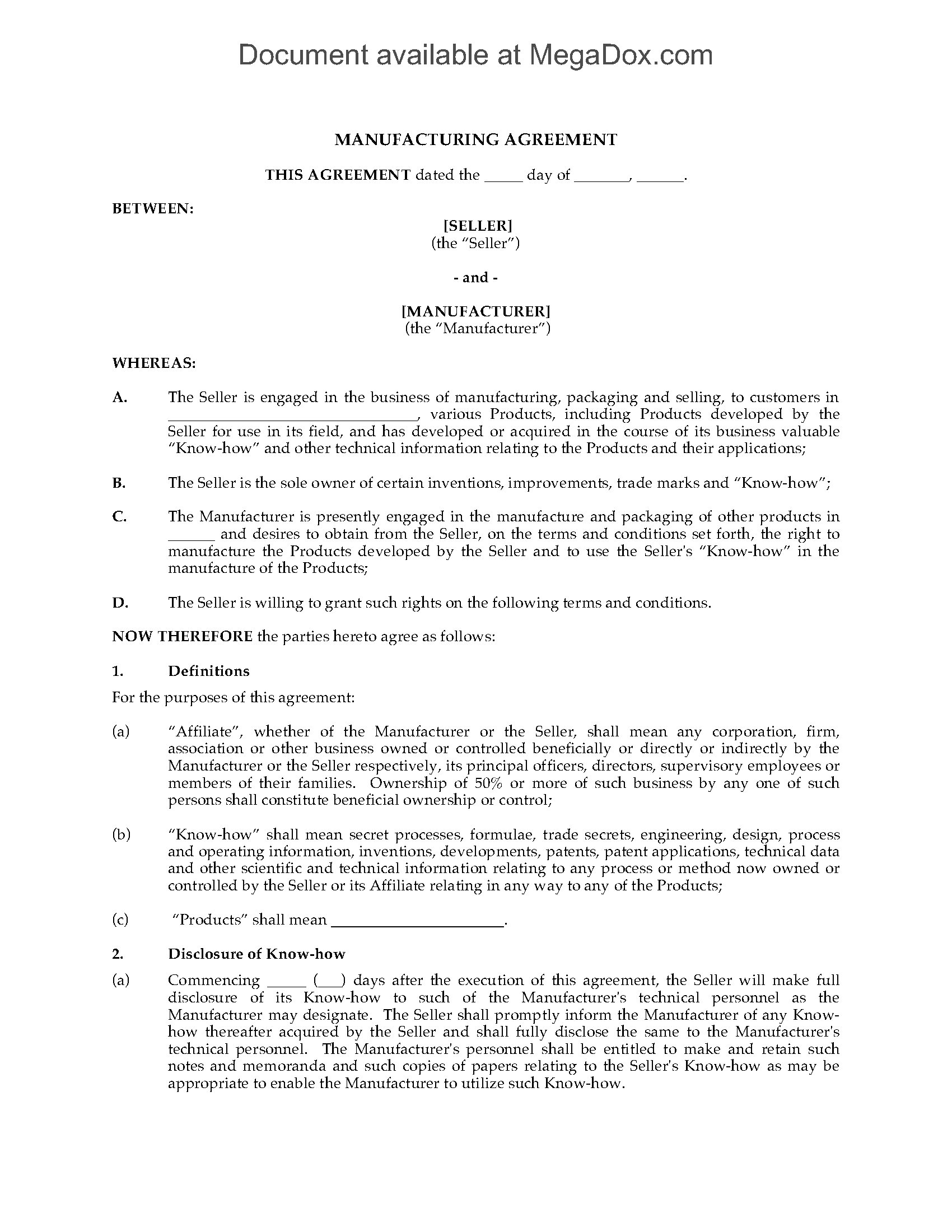 Use this comprehensive template to create a Manufacturing Agreement to manufacture products for a customer.