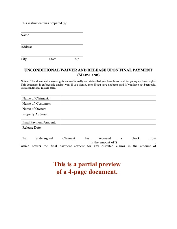 Keep the progress payments coming in on your construction jobs with this Maryland Unconditional Waiver and Release of Lien form.