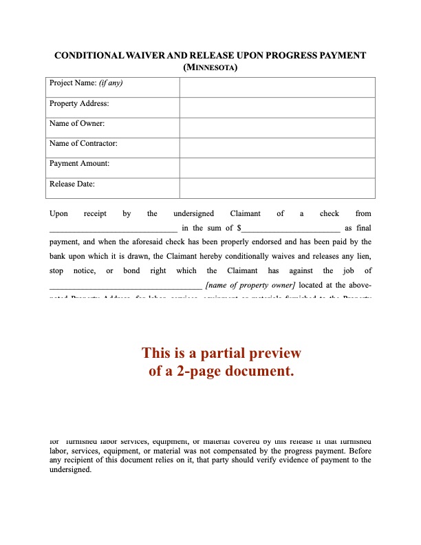 Minnesota contractors, release your lien rights up to the date of a progress payment with this Conditional Waiver and Release of Lien Upon Progress Payment.