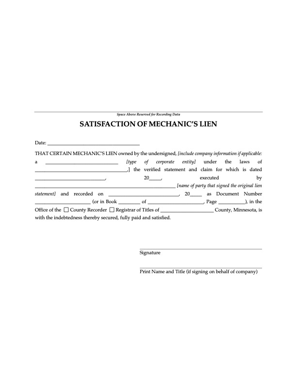 File notice of a lien for labor, materials or machinery supplied for a construction project with this Minnesota Mechanic's Lien Statement.