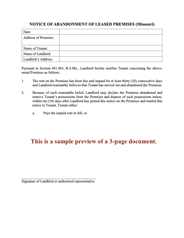 Missouri landlords, if you believe that your tenant has abandoned the rental premises, serve the tenant with this Notice of Abandonment, in accordance with State law.