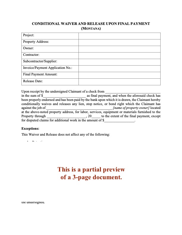 MT contractors, release your lien rights up to the date of a payment with this Montana Conditional Waiver and Release of Lien Upon Progress Payment.