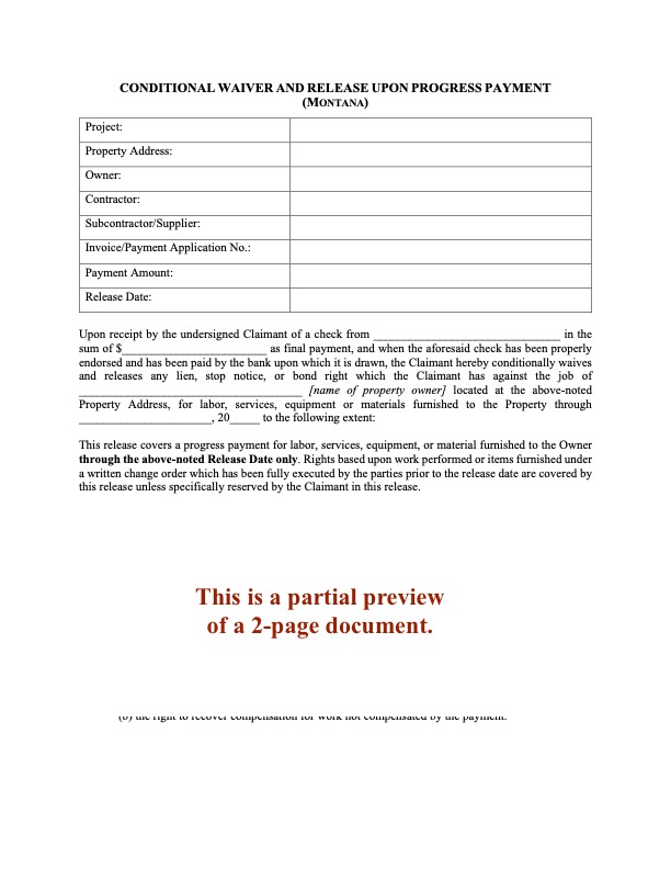 MT contractors, release your lien rights after receipt of final payment on a project with this Montana Conditional Waiver and Release of Lien on Final Payment.