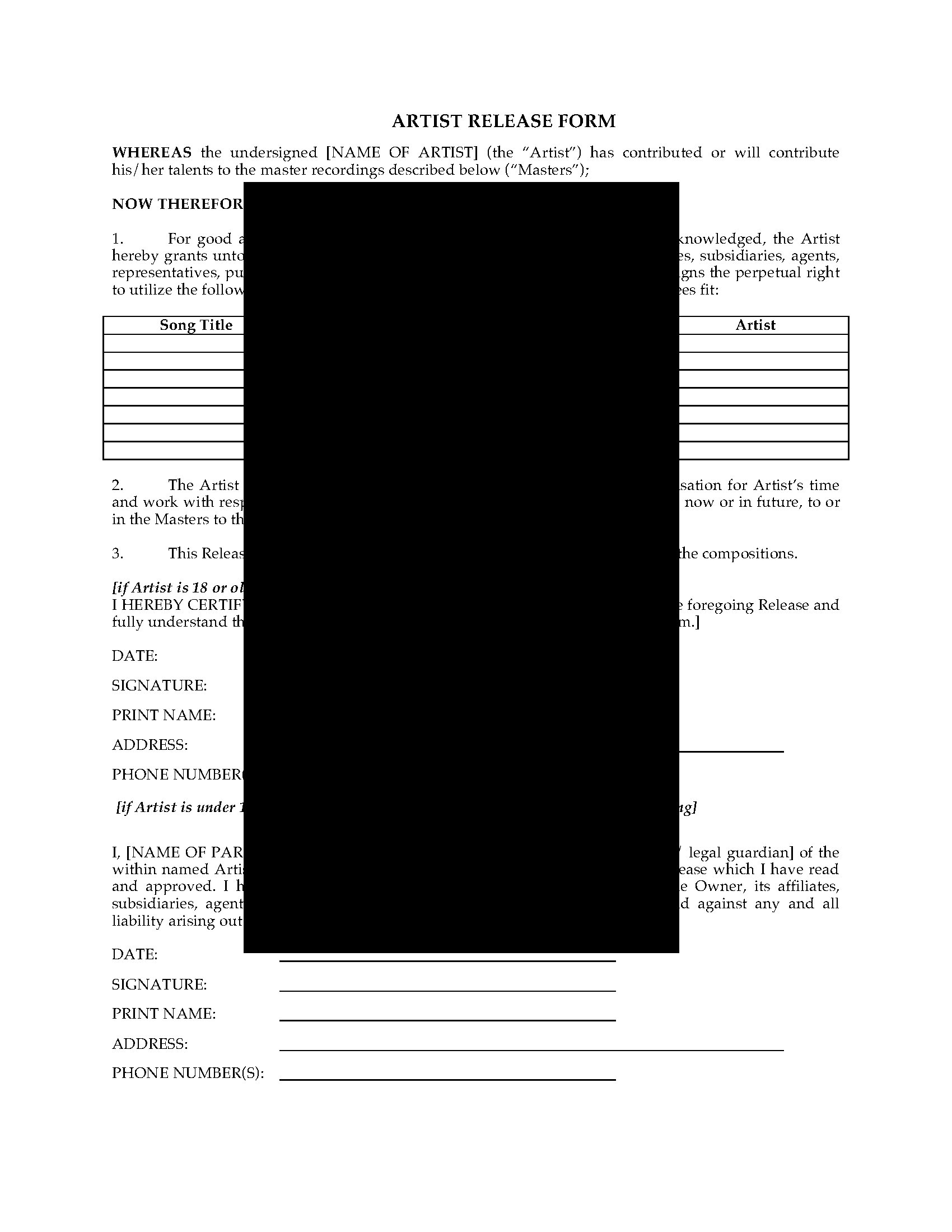 - The artist agrees not to make any claim against the record company for any reason, including invasion of privacy.