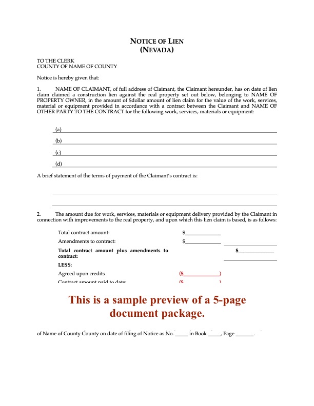 Nevada lien laws require specific forms for both conditional and unconditional lien waivers. These forms conform to those requirements.