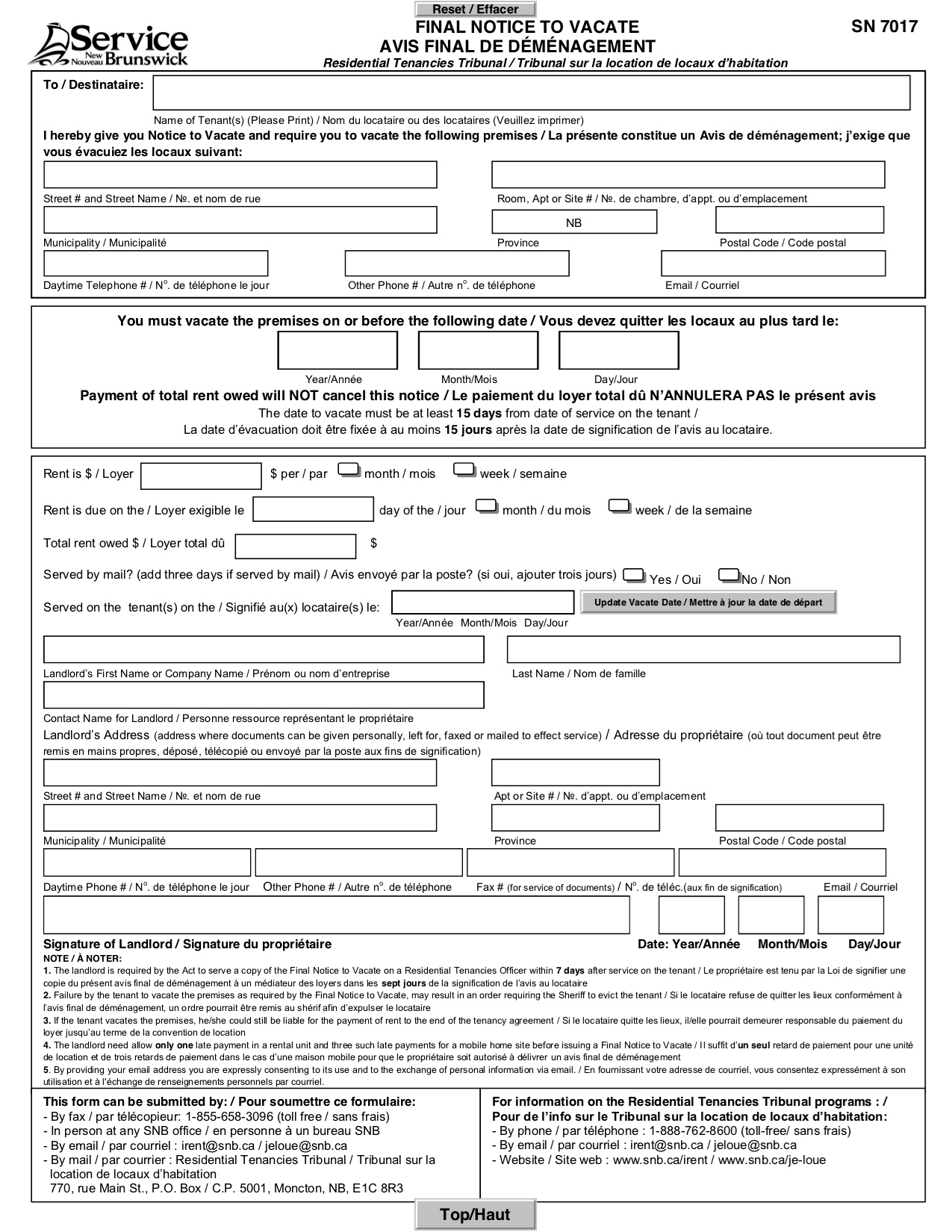 New Brunswick Application for Notice to Quit