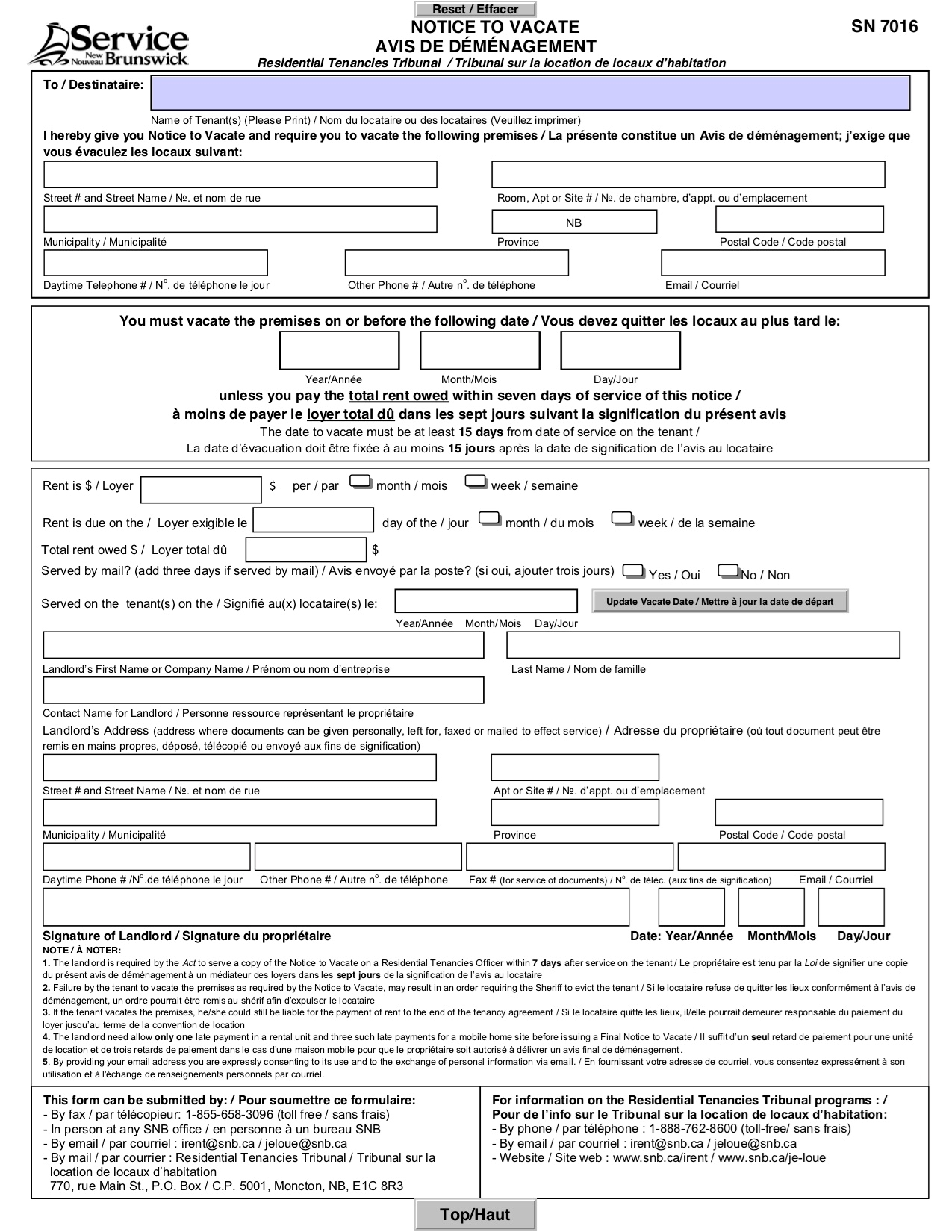 New Brunswick Application for Notice to Quit