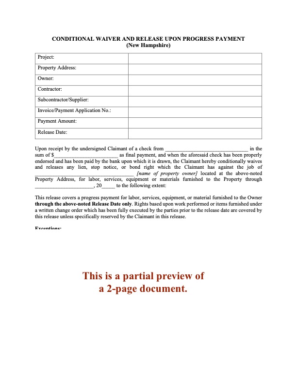 The New Hampshire Lien Waiver and Release Forms are prepared in accordance with State laws and should only be used on projects within that State.