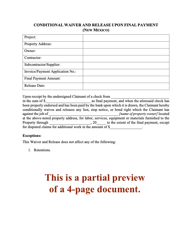 New Mexico Unconditional Lien Waiver and Release on Final Payment