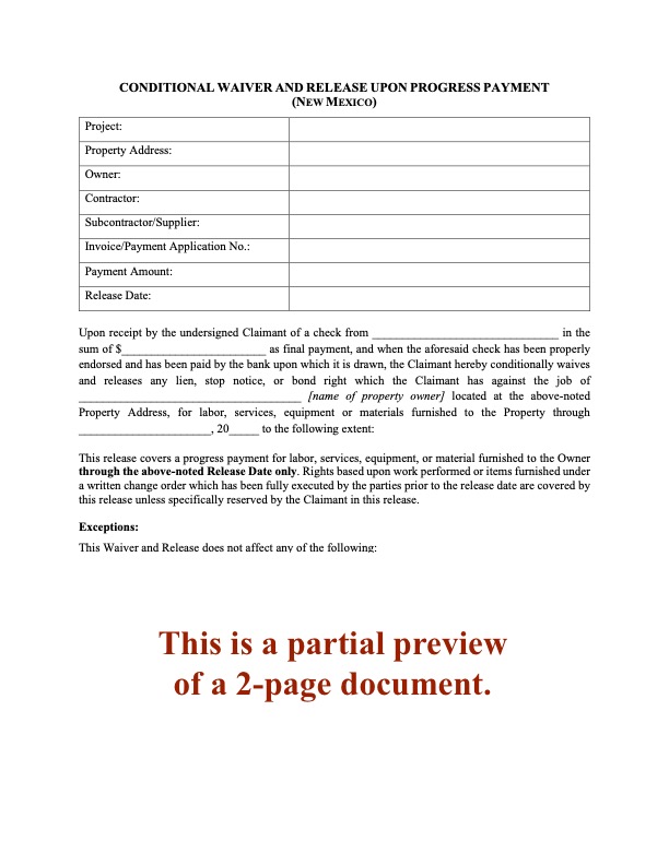 New Mexico Unconditional Lien Waiver and Release on Progress Payment