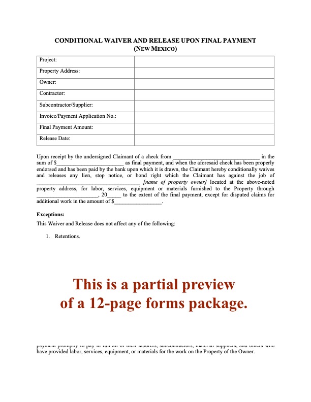 - Conditional Waiver and Release of Lien for final payment. The release does not become effective until payment has cleared.