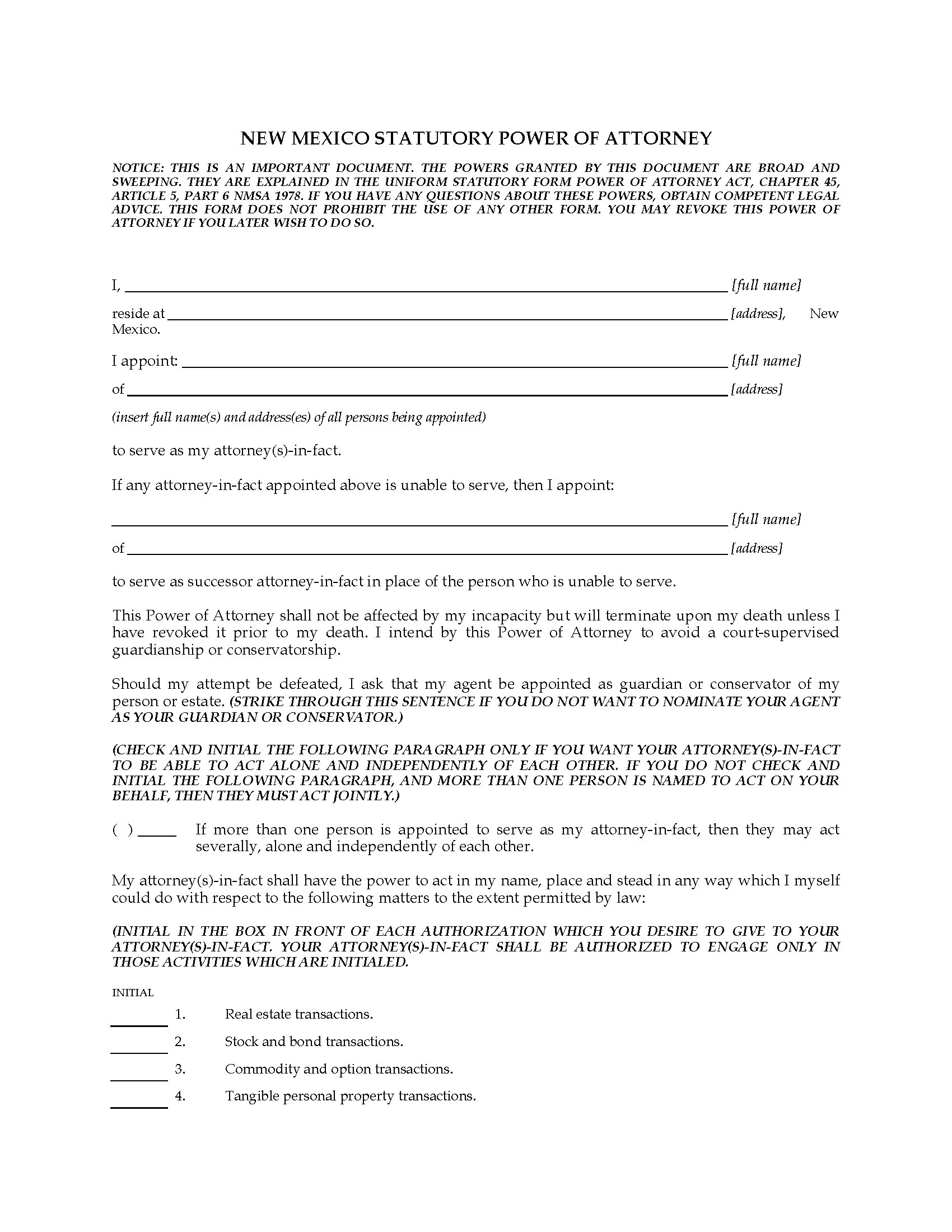 Make a Statutory Power of Attorney with this easy template form, under the New Mexico Uniform Statutory Form Power of Attorney Act, Chapter 45, Article 5, Part 6, NMSA 1978.