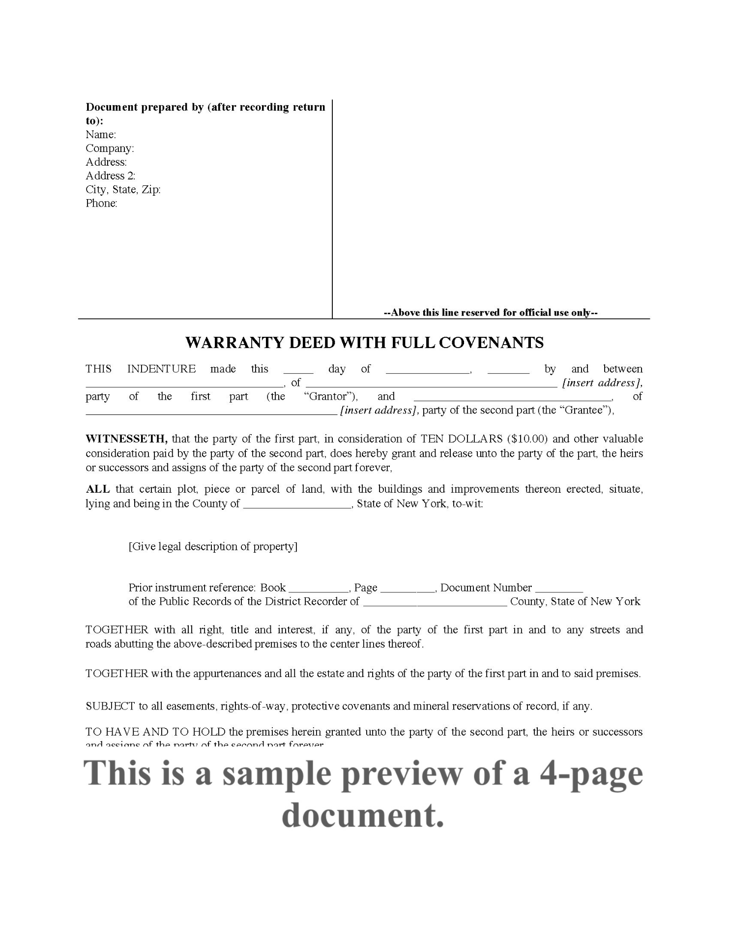 This New York Bargain and Sale Deed With Covenants Against Grantor's Acts form is provided in MS Word format and is easy to download, fill in and print.