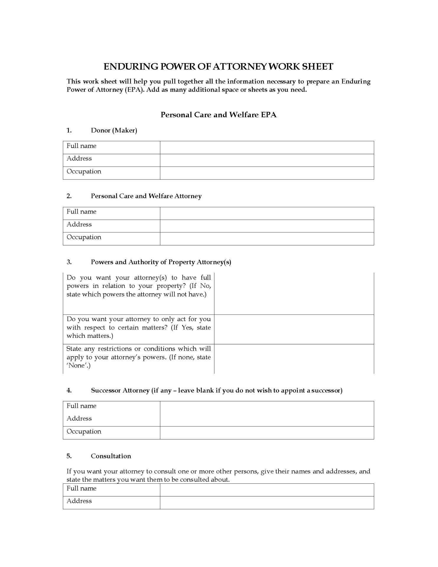 • The work sheet can be used for both a Personal Care and Welfare EPA and a Property EPA.