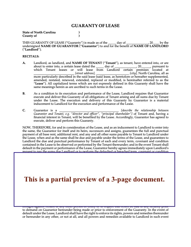 The Guaranty of Commercial Lease form is available in MS Word format and is fully editable and reusable. It is intended to be used only in the State of North Carolina.