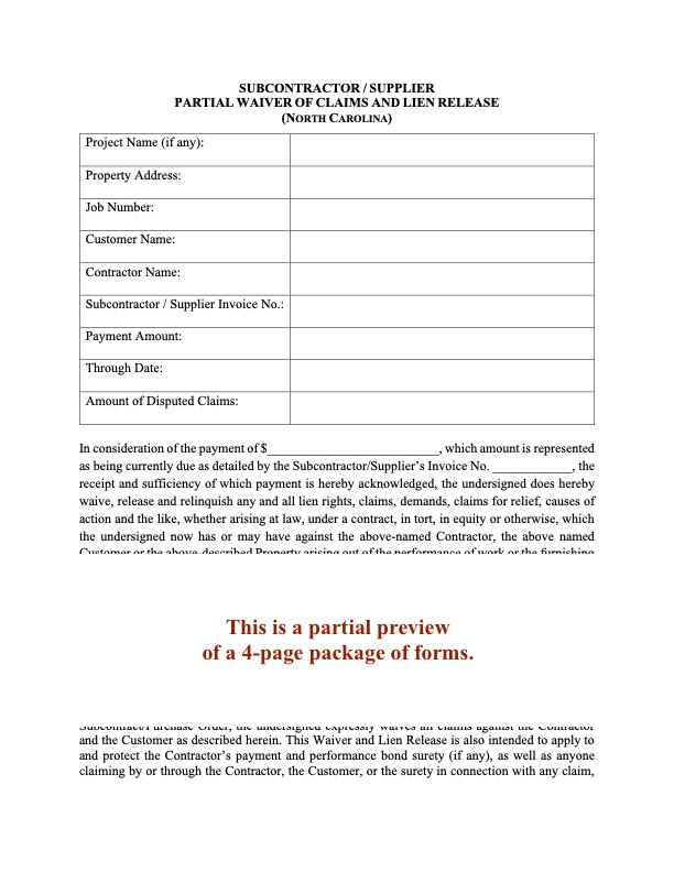 The North Carolina Lien Waiver and Release Forms are prepared in accordance with State laws and should only be used on projects in North Carolina.