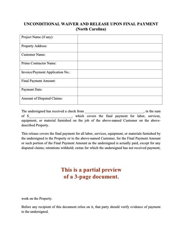 North Carolina contractors, release your lien rights after receipt of final payment on a construction project with this Unconditional Waiver and Release of Lien Upon Final Payment.