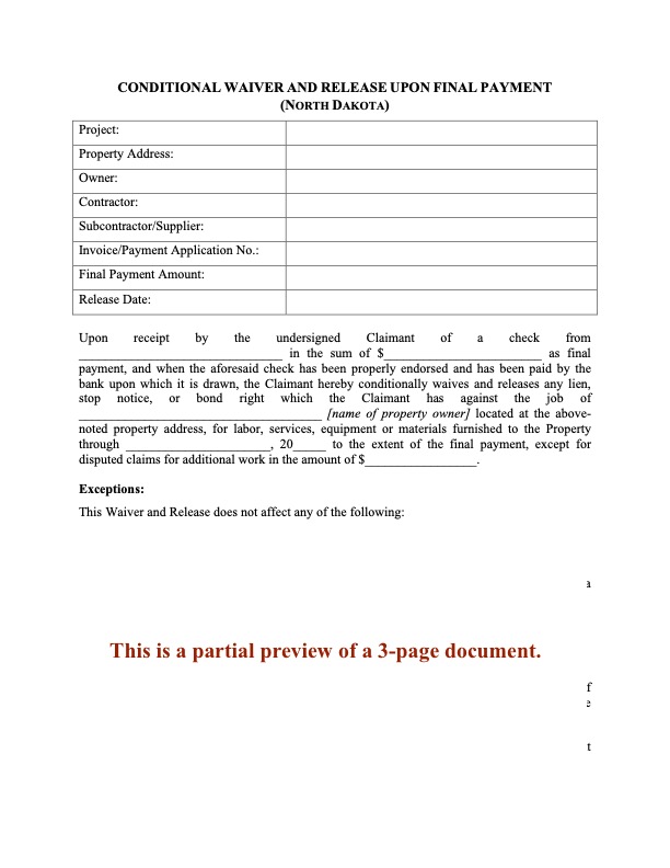 The North Dakota Lien Waiver and Release Forms are prepared in accordance with State laws and should only be used on projects in North Dakota.