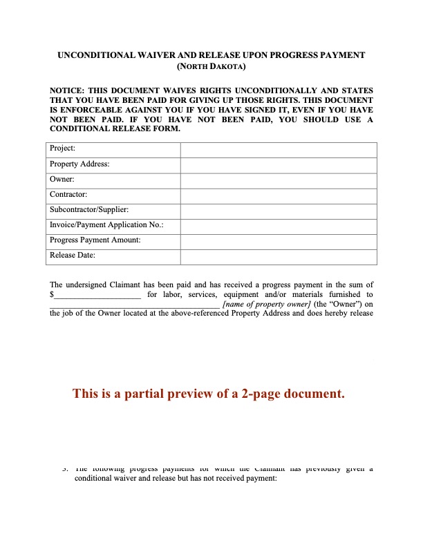 North Dakota Unconditional Lien Waiver and Release on Final Payment