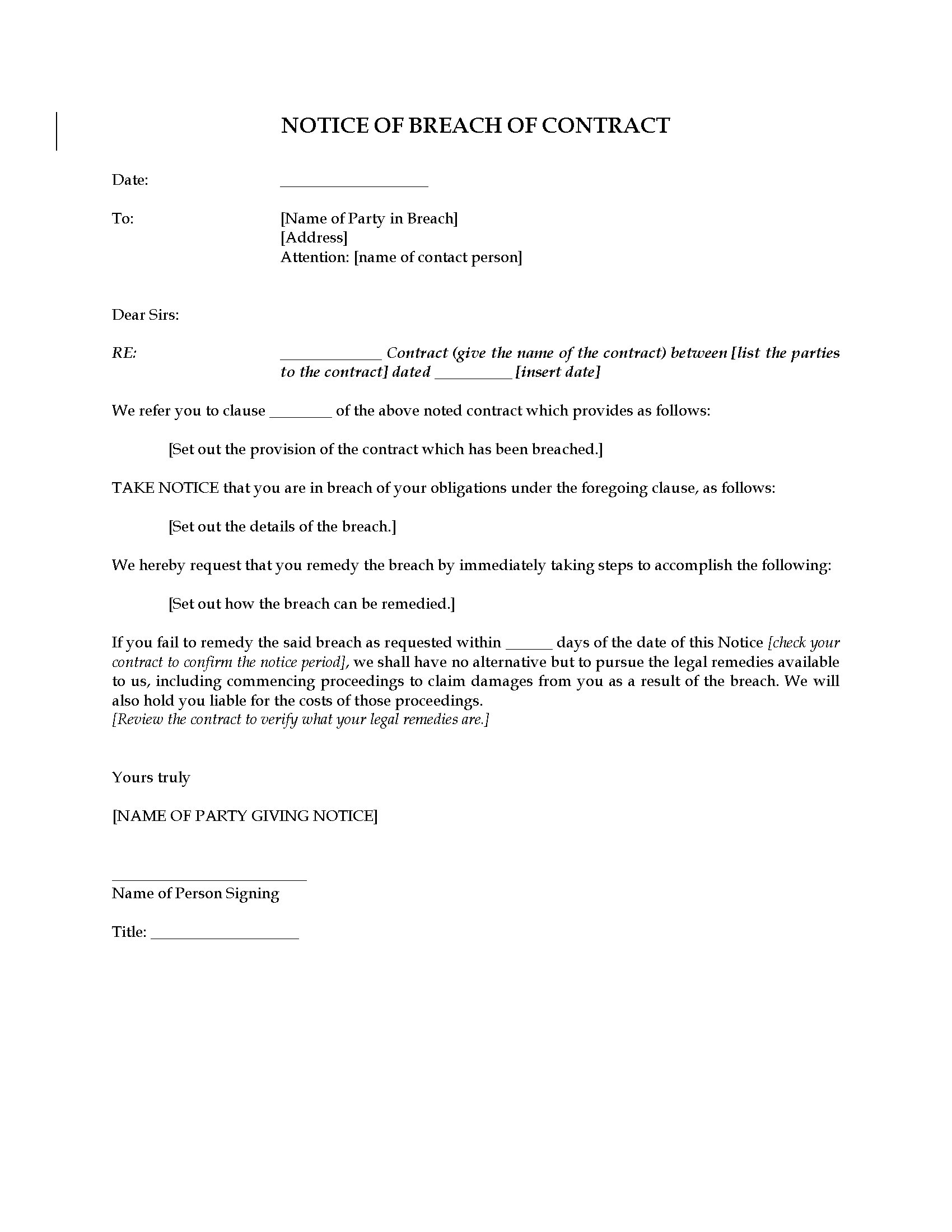 - If the breach is not remedied in the time provided, the defaulting party is notified that you intend to pursue your legal remedies, including commencing legal action.