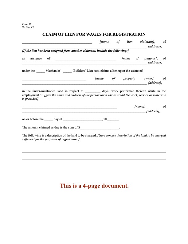- Claim of Lien for Wages for Registration (Form B under the Builders' Lien Act),