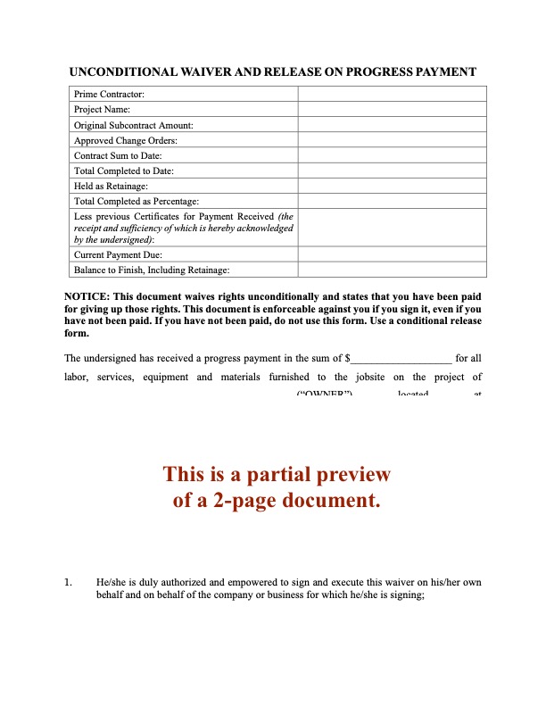 - Partial Waiver and Lien Release for use by lower tier subcontractors and suppliers not in direct contact with the contractor,
