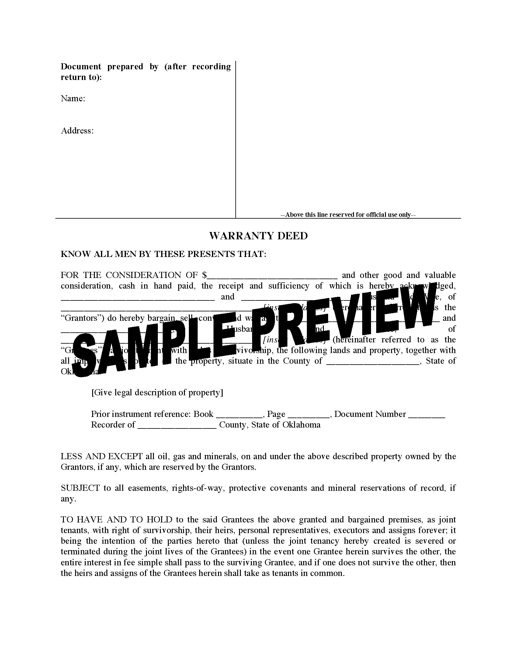 Oklahoma Warranty Deed for Joint Ownership form is provided in MS Word format and is easy to download, fill in and print.