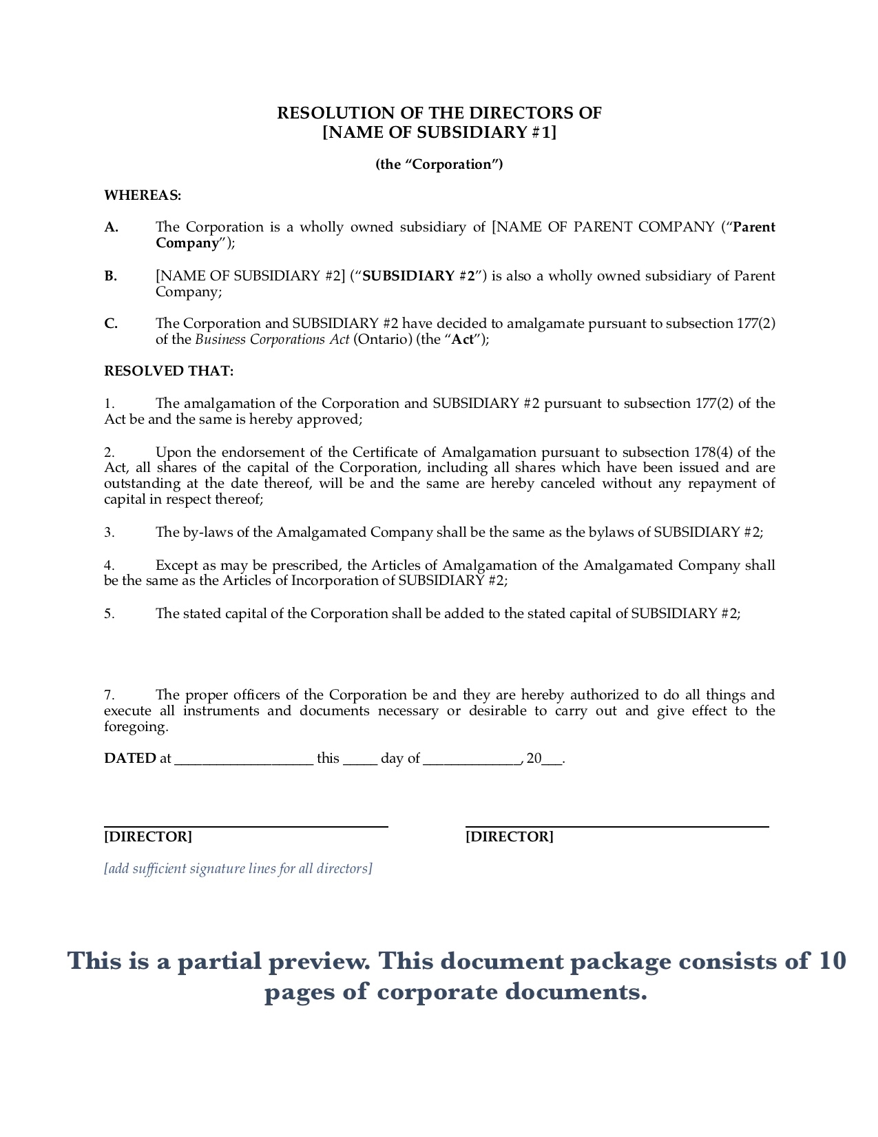 Prepare the corporate documents and resolutions required for a short form vertical amalgamation in Ontario with this package of forms, which contains: