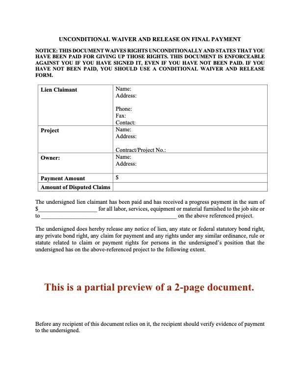 - This release form should only be used if the contractor has received final payment (except for any disputed amounts).