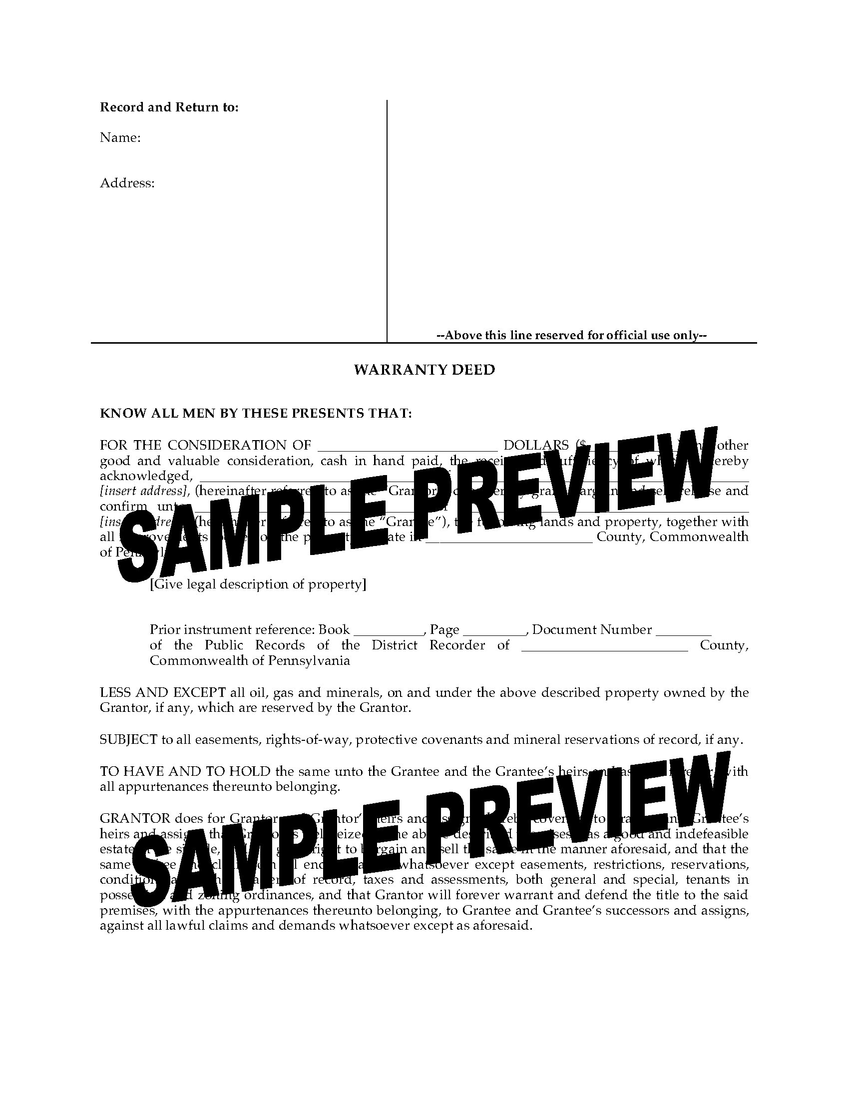 Under a Special Warranty Deed, the seller (grantor) warrants or guarantees the title only against defects arising during his/her ownership of the property and not against defects existing before that time.This Pennsylvania Special Warranty Deed form is available as a downloadable MS Word document, and is easy to fill in with the details of your transaction.
