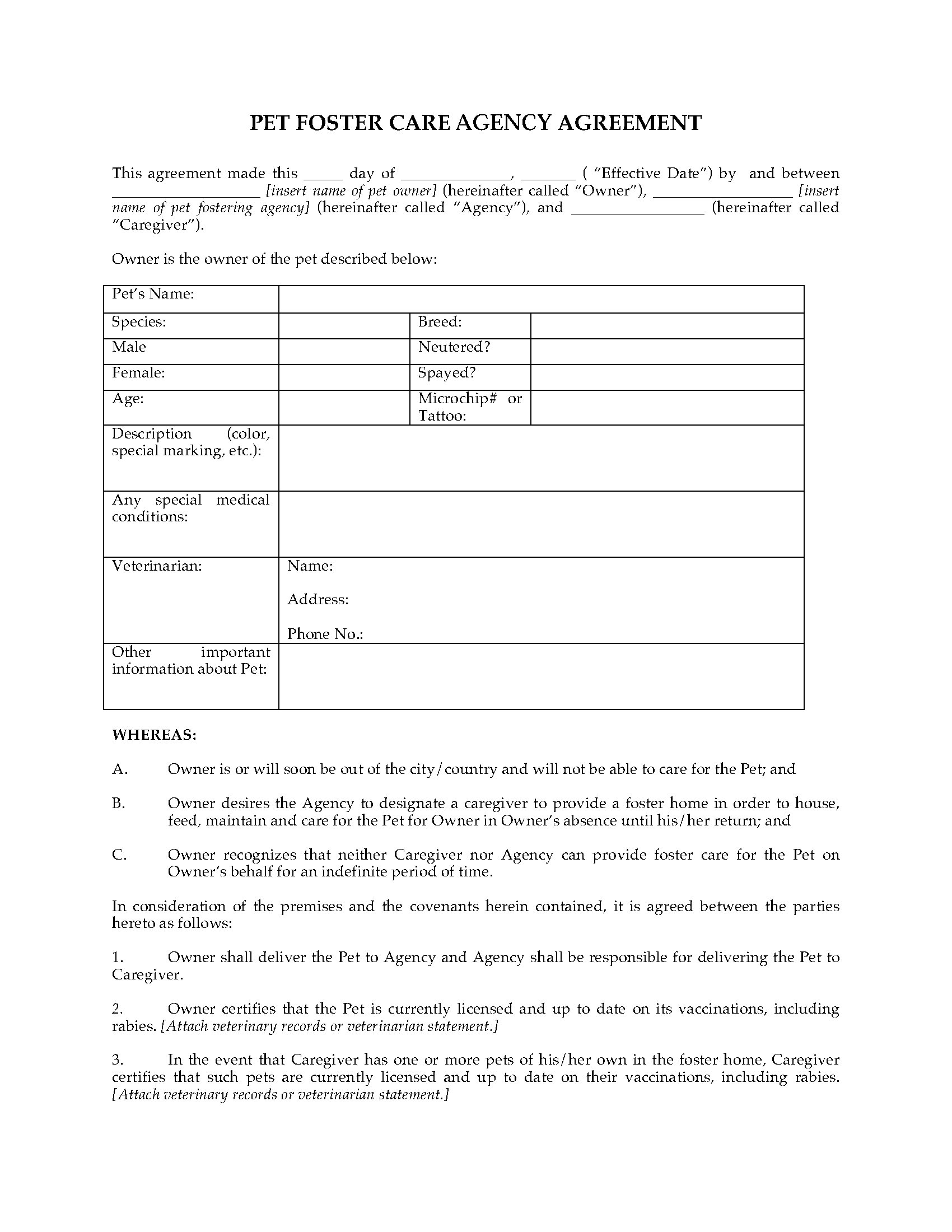 - There are three parties to the contract - the pet owner, a foster care agency, and the foster parent.