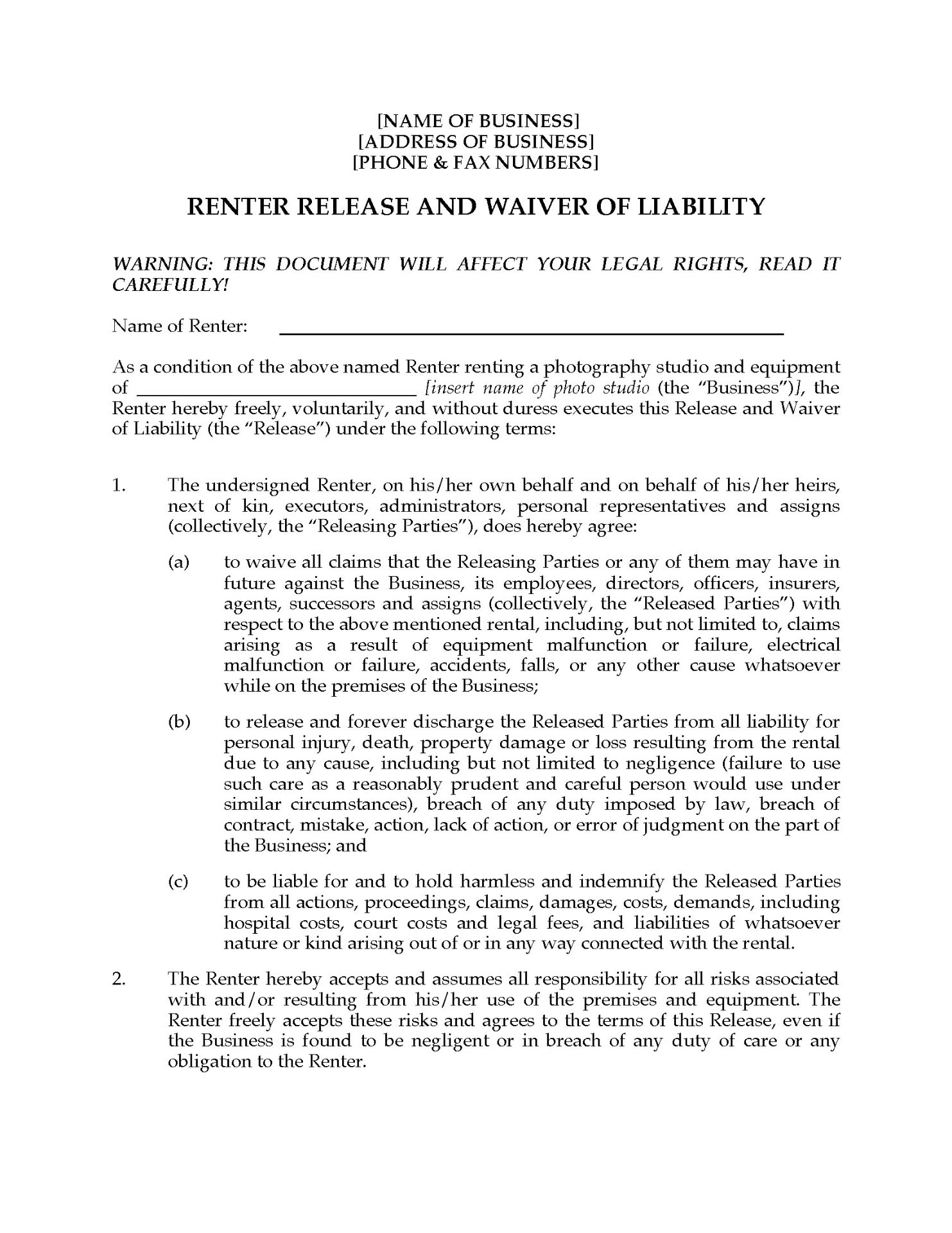- The studio has no liability for damage, loss, or injury, and the renter indemnifies and holds the studio harmless against any claims.