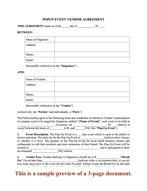 This easy-to-use Pop-Up Vendor Space Contract template is designed to facilitate the rental of vendor spaces at pop-up art and artisan markets. The contract sets out clear responsibilities and requirements for both the vendor (artist) and the market operator (licensor).