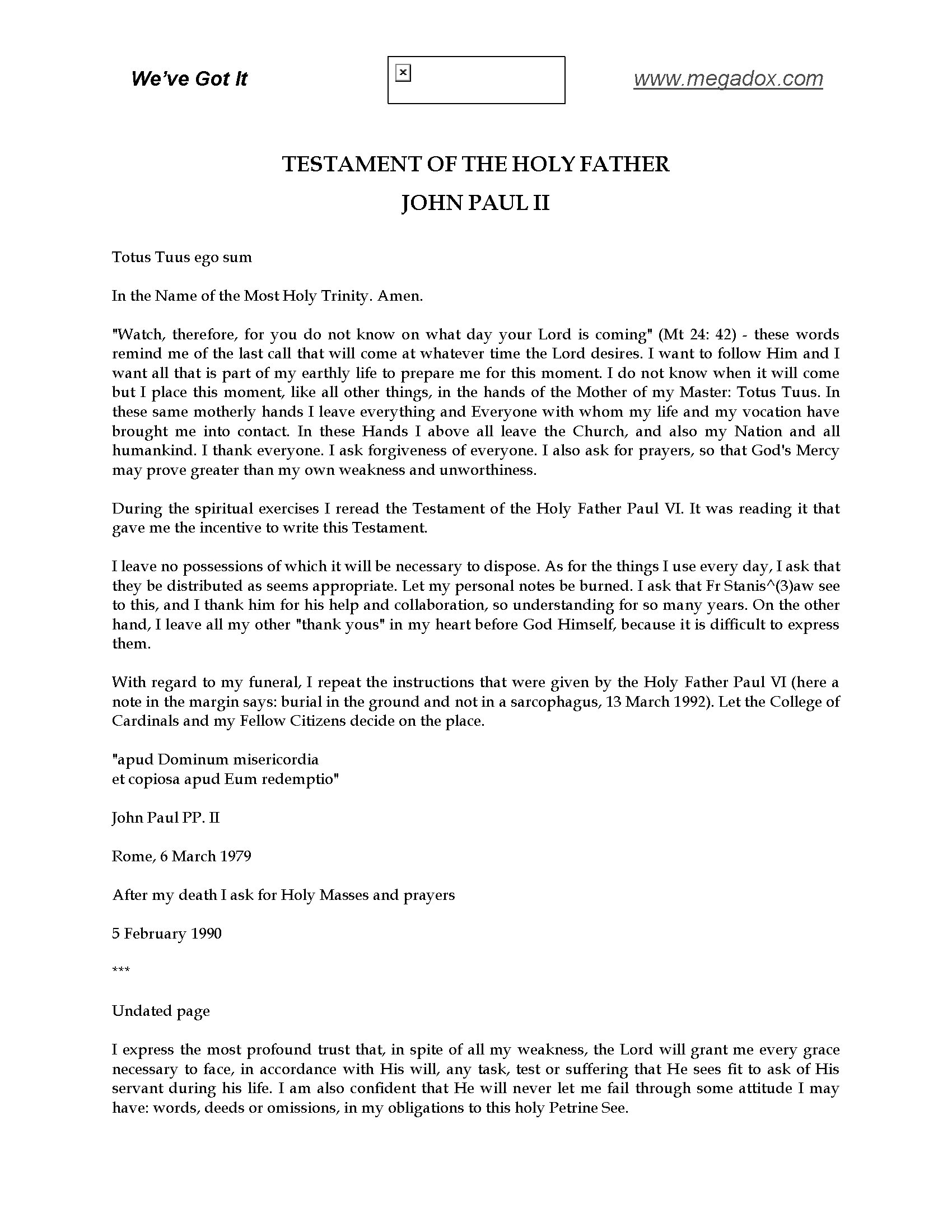 This is a copy of the Last Will and Testament of Pope John XXIII (1881-1963).