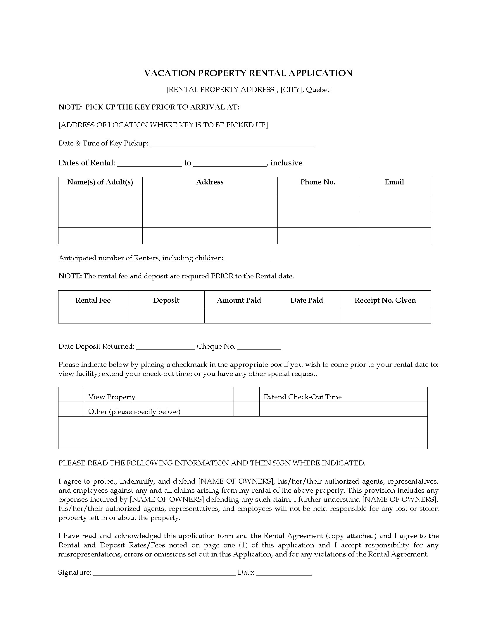 Get prospective renters for your vacation home to fill out this Quebec Vacation Property Rental Application.