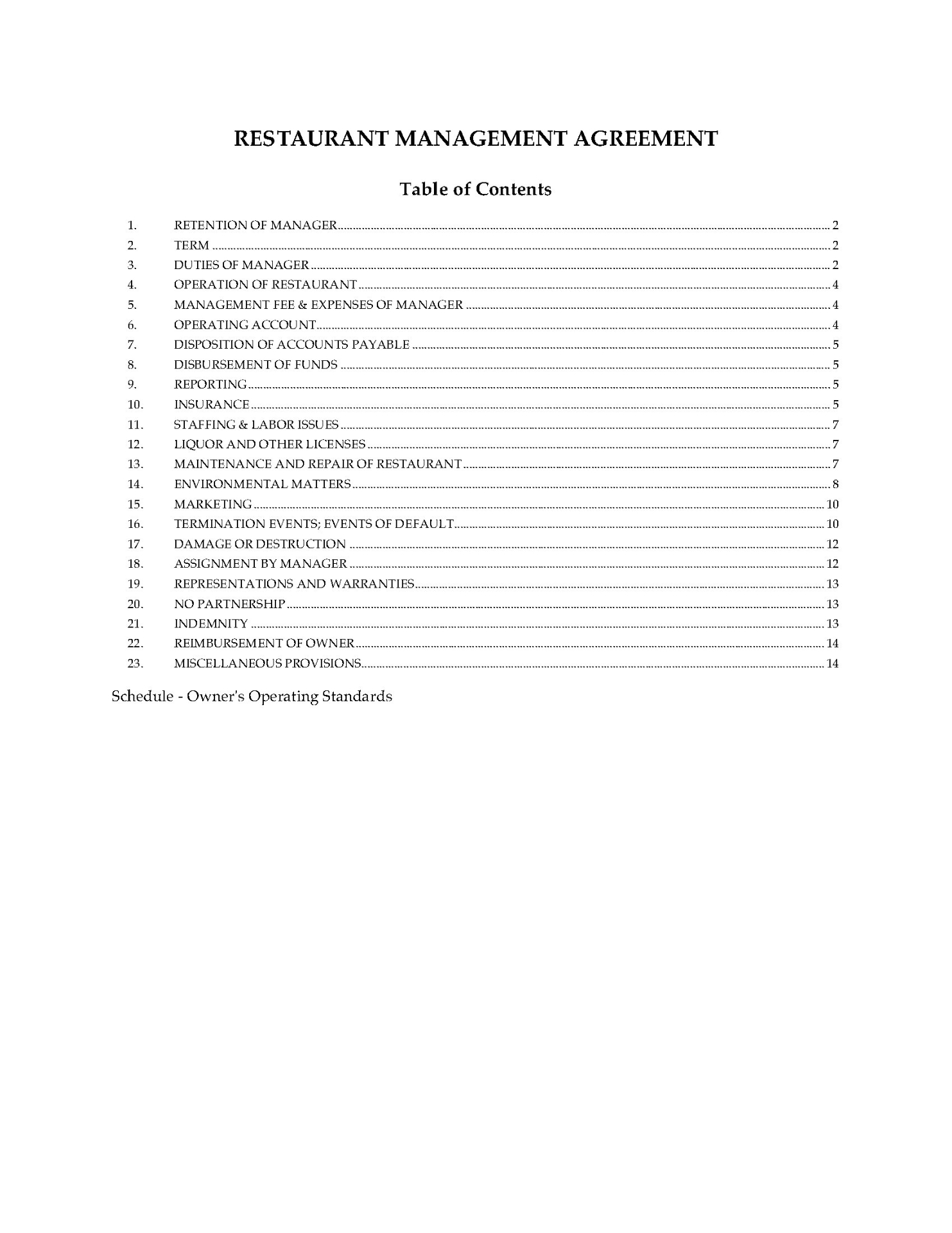 This Restaurant Management Agreement is a generic legal document that does not reference the laws of any specific country or jurisdiction. As such, it can be readily customized to address the unique needs and circumstances of any restaurant operation.