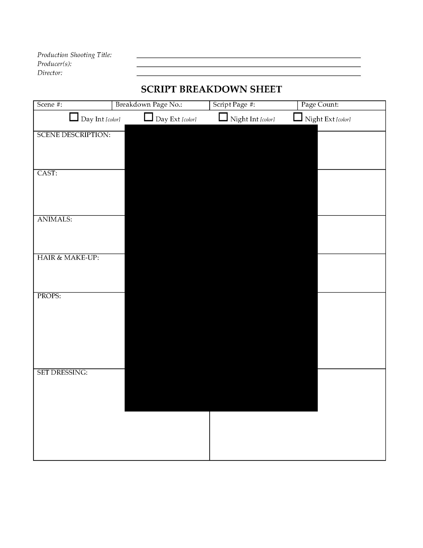 This free template is a blank script breakdown sheet for the art department on a film production.