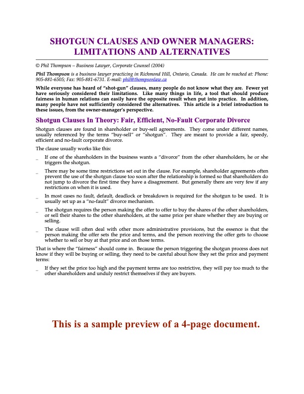 - The departing shareholder must resign as a director and/or officer upon closing of the share purchase.