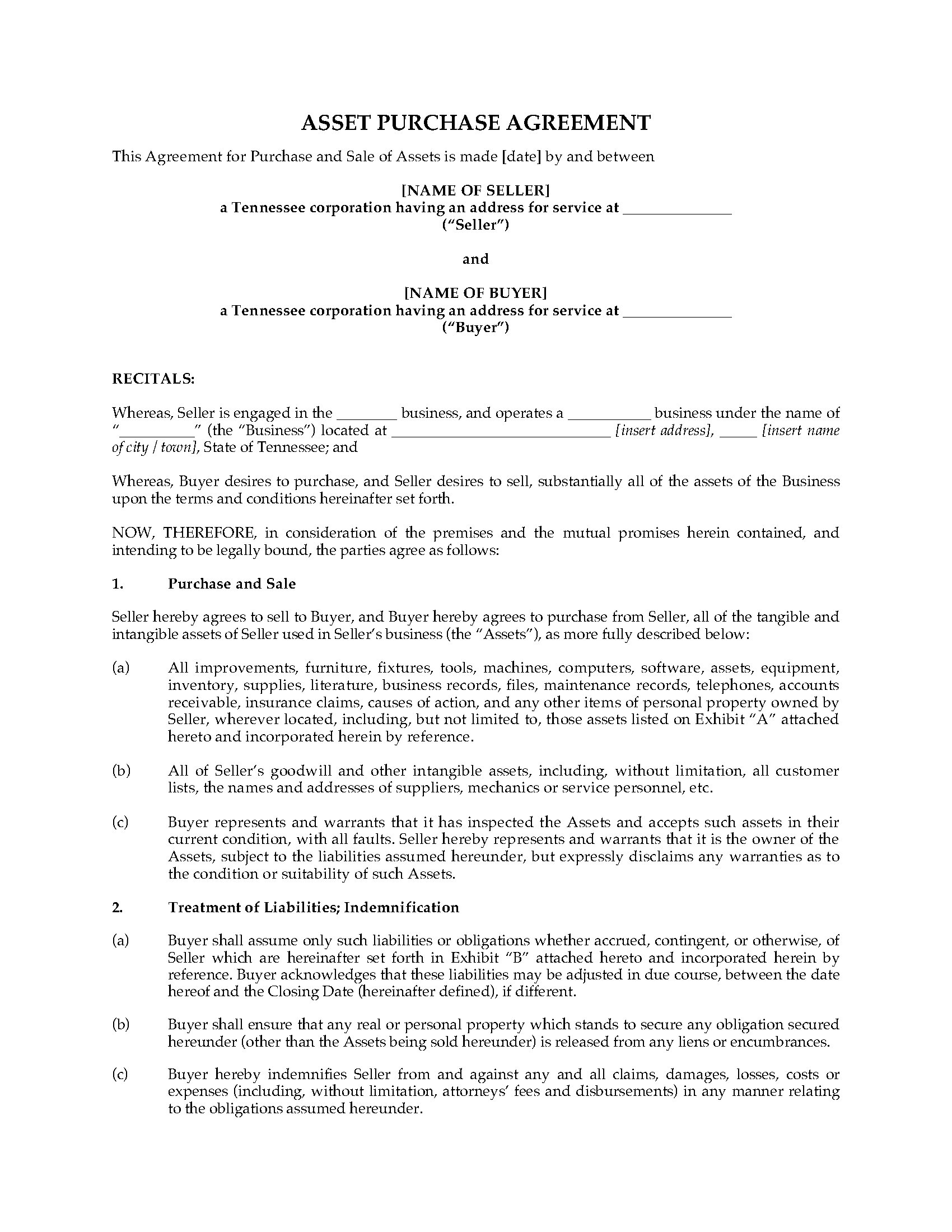 This Tennessee Asset Purchase and Sale Agreement is ideal for transactions which do not involve a broker. It includes standard form language and provisions and is easy to customize.