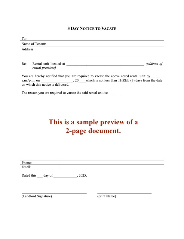 The 3 Day Notice to Vacate template is available in Microsoft Word format. It is designed for easy downloading, completion, and printing. The form is reusable and is ideal for both landlords and rental property managers.