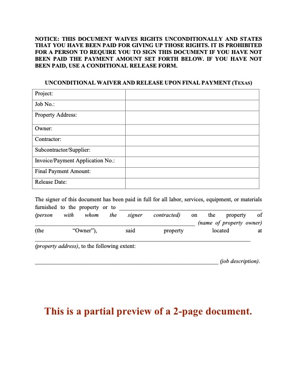 Texas Conditional Lien Waiver and Release on Final Payment