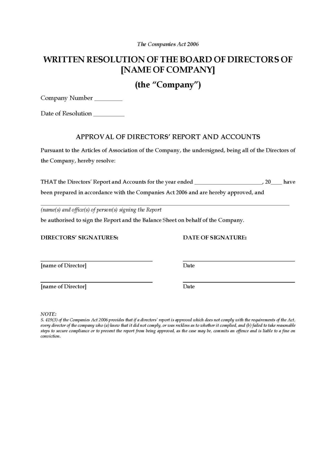 - The Resolution can be used by a private company limited by shares, in accordance with The Companies Act 1985.