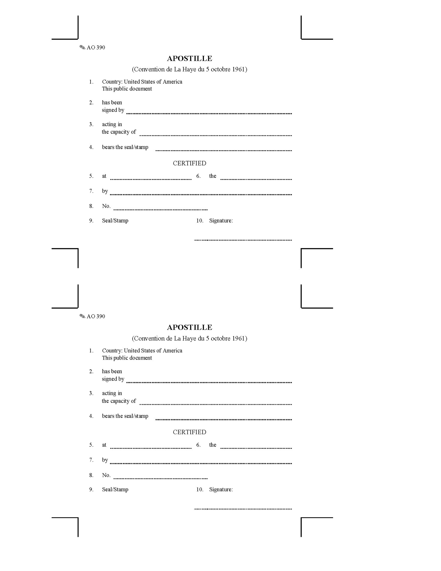 - Apostille Certificate, United States District Court Form AO 390.