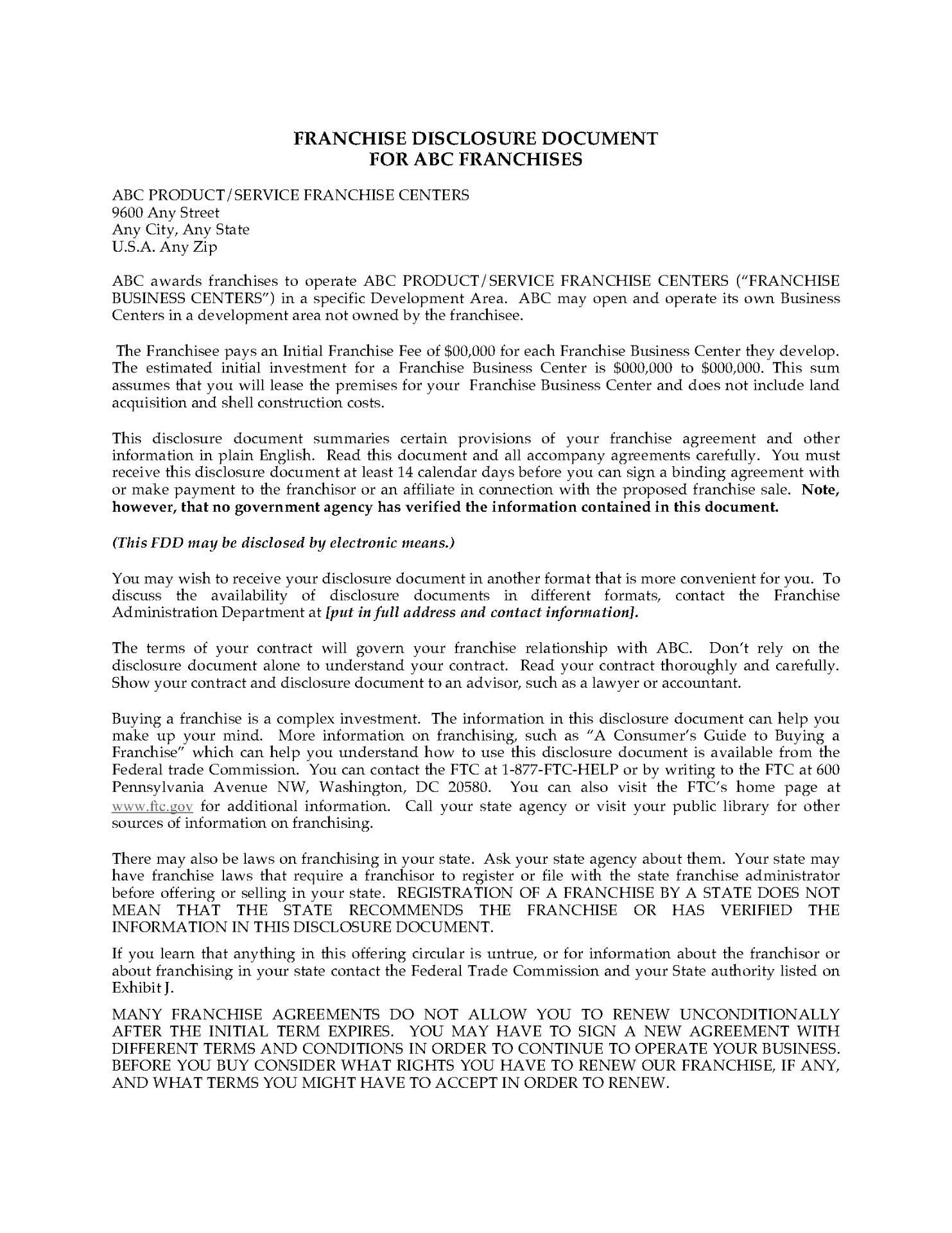 This is a comprehensive 50-page franchise agreement template which includes the following items: